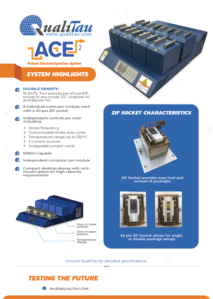 Electromigration effects on semiconductor devices used under AC conditions have typically been approximated using “corrected” results from DC testing. However, the ongoing miniaturization of components and the need to re-evaluate traditional DC-to-AC correction factors have created a growing demand for advanced testing tools and techniques that more accurately simulate “real-world” degradation of devices under AC conditions. To meet this demand, QualiTau has developed the ACE2 electromigration pulsed testing system.