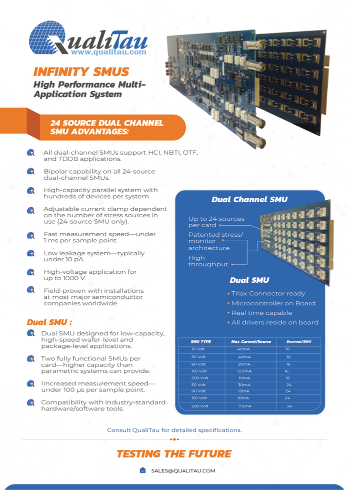 QualiTau’s Infinity testing system features a flexible modular architecture, allowing for easy upgrades from a small-scale package or die test setup to a high-capacity test system. It supports both package and wafer-level testing. The system can accommodate up to 16 Source & Measurement Unit (SMU) cards, with each SMU offering up to 24 voltage sources, for a total of 384 sources. A wide range of SMU options is available to meet specific testing requirements.
