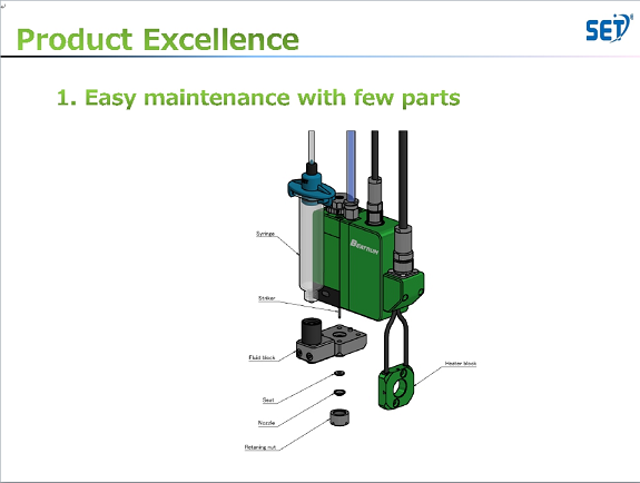 innovatively designed square-cut nozzle, SV70 ensures superior stability without overspray, as well as a faster and drip-free dispensing process.